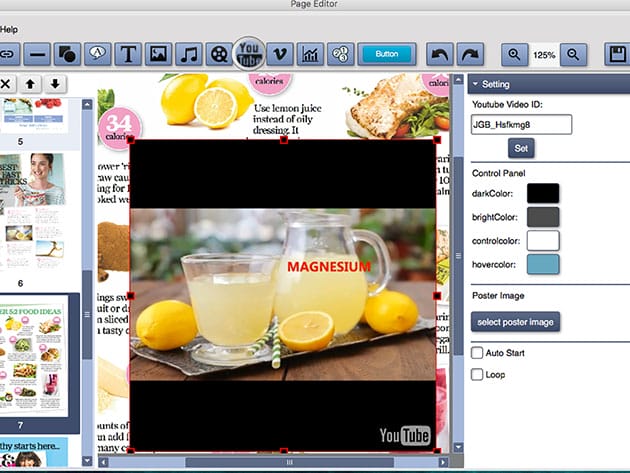 Embed line, shape, callout, text, image, GIF, music, video, YouTube video, Vimeo video, button & number icons to flipbook pages