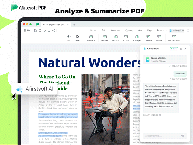 AI PDF: Enhance your PDF experience with Afirstsoft AI. Chat with your PDFs to get answers to any queries, and let the AI summarizer extract key information, saving you time and effort.