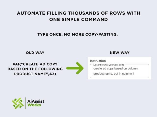 • Effortless AI Integration: Say goodbye to formulas, scripts, and manual copy-paste. AiAssistWorks lets you use AI in plain language, simplifying complex tasks directly within Google Sheets™, Docs™, and Slides™.