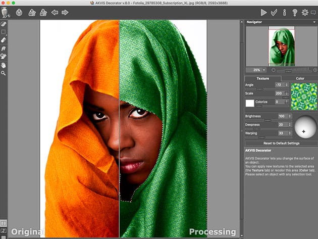 Do you want to make with a click a car in snakeskin or a statue dressed in fine clothes? With AKVIS Decorator you can create things that were unimaginable even to Mother Nature. It lets you change the surface of an object in a realistic manner. There is a great variety of patterns in the built-in Texture Library, more than 1800 textures, to apply; from fabrics to stones and metal, from food to nature elements. You can even apply your own texture. The software follows the underlying features of the object, the texture that already exists. The new pattern looks absolutely natural and makes you see things differently. Experiment with Decorator to discover its full potential!