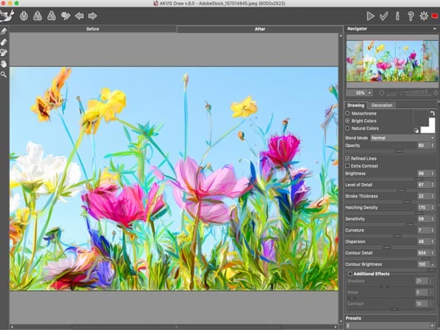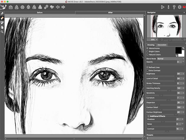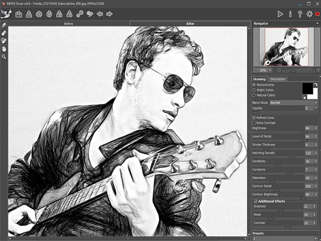 AKVIS Draw lets you create hand-drawn pencil sketches and line art pictures from your digital photos! The software is incredibly easy to use; it makes a realistic looking drawing effect in just one click! Equipped with the ready-to-use presets and adjustable parameters, the program renders various esquisse drawing styles. Besides creating black and white sketches, the software also lets you make color drawings. Load your image into the program and adjust settings to generate an artwork. The software creatively produces pencil strokes, imitating an artist’s view.