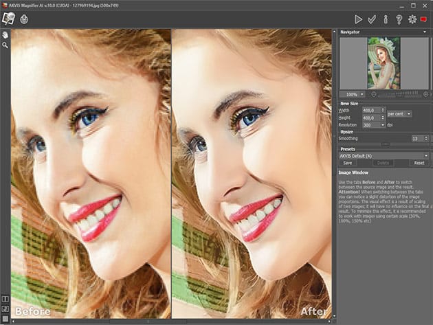 AKVIS Magnifier AI is an efficient tool for increasing image resolution. If you attempt to blow up a picture using the standard Resize command of a photo editor, you will notice that the resulting photo is blurred and pixelated. Magnifier AI copes with this problem and delivers high-quality results. Featuring advanced resizing neural networks based algorithms, Magnifier AI enlarges digital pictures to super-high resolution up to 800% for producing stunning wall-sized prints! The program allows enlarging an image to a super-high resolution, making large format gigapixel posters and panoramas.