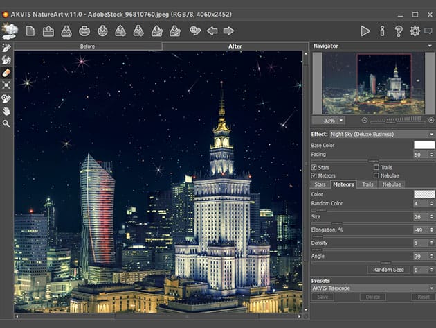 It’s hard to compete with nature in diversity, and man still has much to learn from it. We cannot create the Earth in seven days, but we can imitate some of its natural phenomena in digital art. AKVIS NatureArt is an excellent tool for imitating the magnificence of natural phenomena in your photos. The software lets you apply weather effects to your picture or create nature scenes from scratch, converting a blank background into a sea view or a night sky with scattered, glistening stars. The effects in NatureArt are easy to add and adjust. Just select an area in the image and apply the effect. You can even save your favorite settings as a preset and use them in the future.