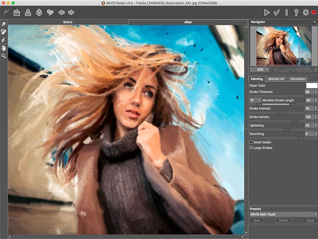 Pastel bridges the gap between painting and drawing. The pastel sticks consisting of powdered pigment generate soft velvety strokes with subtle edges that can be smeared with your fingers. AKVIS Pastel is a powerful tool to unleash your creativity. You can choose one of the presets’ effects or change the pastel settings to create a unique painting. The adjustable effect parameters give you a strong sense of control over your digital art. Create your new pastel with a mouse click. The advanced brush tools will help you refine the result, change the direction of the automatic strokes, strengthen or weaken the pastel effect on different areas, and put the finishing touches on your picture.