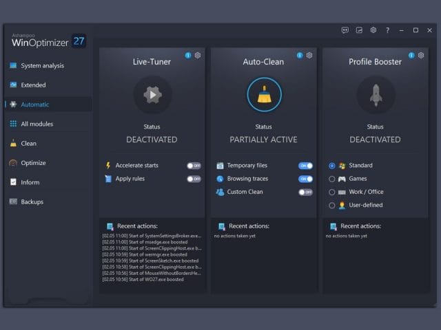 With the new Ashampoo WinOptimizer 27, you automatically get the best Windows experience. Its new automation accelerates, cleans, and tunes your applications. Have your PC seamlessly adapt to your needs with process prioritization, automatic cleanup of temporary files, and custom profile configurations based on the new Profile Booster. Whether for gaming, work, or browsing, maximizing your system’s performance, or conserving resources, the choice is yours. The new Crash Analyzer offers deep insights into system crashes and their causes, while four advanced cleaners ensure privacy and provide system maintenance. Thanks to improved memory management, WinOptimizer can now utilize more resources to perform comprehensive analyses almost instantly!