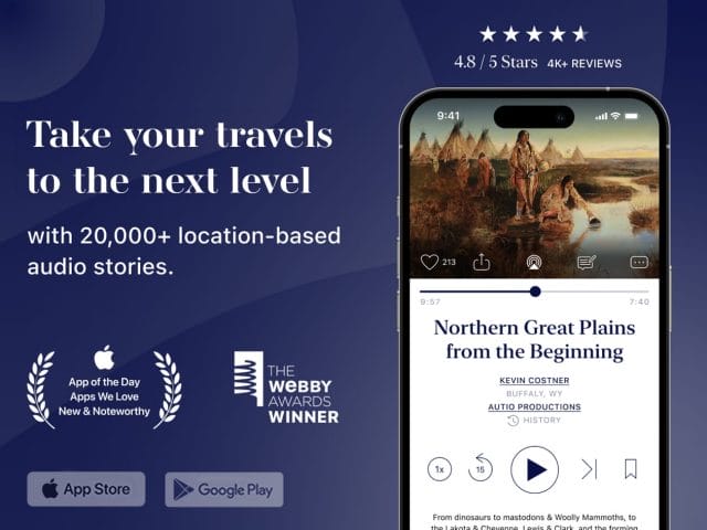 Autio is a network of stories, told by master storytellers like Kevin Costner, Phil Jackson, and John Lithgow, with the power to bring the landscape, its people, and its history alive as you pass through it.