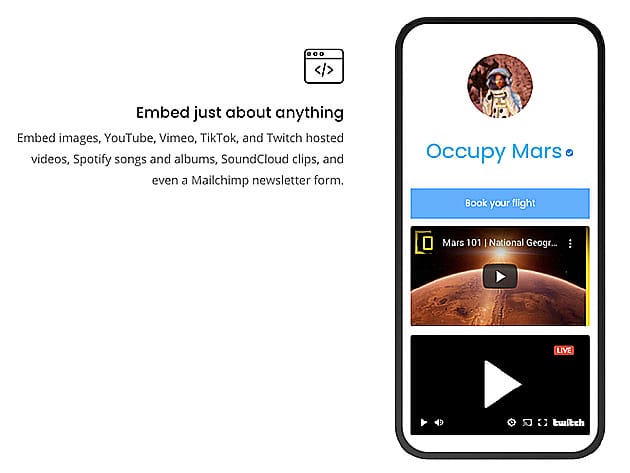 • Embed images, YouTube, Vimeo, TikTok, Twitch hosted videos & more