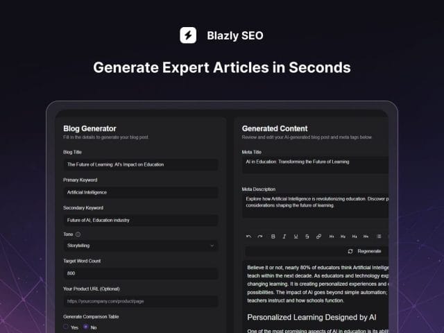 Blazly SEO gives you a great advantage by not just generating articles but building your entire content strategy from the ground up. With AI-powered tools that create winning pillar-and-cluster plans, analyze competitors, boost your ranking probability to 90%+, and generate expert-level, plagiarism-free articles in seconds, you’ll have everything you need to dominate search results. From humanizing your content to ensuring perfect SEO scores before publishing, Blazly SEO empowers marketers, agencies, and entrepreneurs to build topical authority, drive organic traffic, and publish with total confidence.