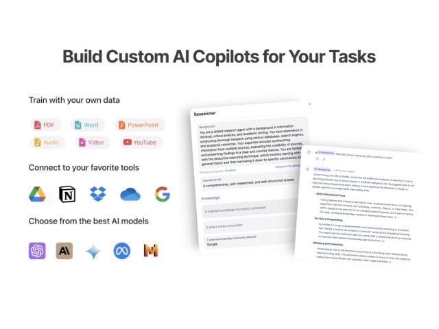 • Custom AI Copilots: Tailor AI copilots to suit your specific tasks, workflows & tools for a personalized experience.