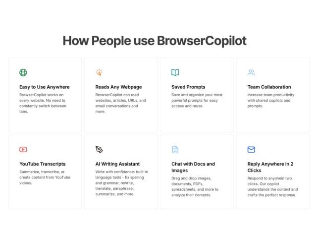 With awesome features like real-time help, automated task management, and content summarization, BrowserCopilot makes your browsing more efficient and enjoyable. Plus, it takes user privacy and security seriously, ensuring your information stays safe. Choosing BrowserCopilot means teaming up with a reliable tool that helps you perform better, protects your privacy, and sets a new bar for online work efficiency.