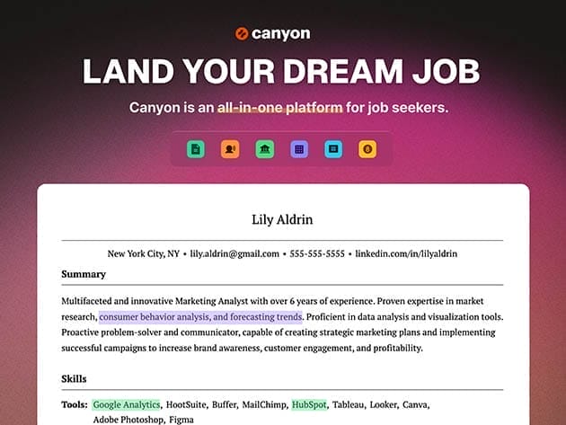 Canyon Resumé Score: Canyon Score provides real-time analysis based on your skills, experiences, and qualifications to help you build the perfect resume.