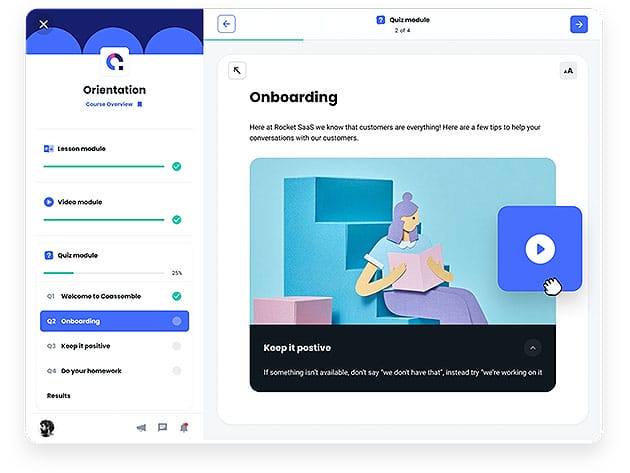 Learning management system (LMS) users want a better experience (83% of them say so). That’s why Coassemble was built, a UX-driven platform that lets you translate your business knowledge into clear, concise, and easily digestible courses. Coassemble is an online training tool that connects people with the information they need – anytime, anyplace. Create amazing training courses, track your team’s progress, and integrate with your most-used apps like Gmail, Slack, and Mailchimp. If you’re a startup founder, a manager, or an HR professional, it’s time to take Coassemble for a spin and see what it can do for your business.