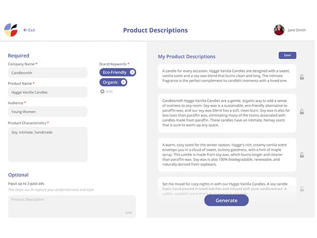 Automatically generate high-performing Google ads, Facebook ads, product descriptions, taglines, SEO metatags, & more