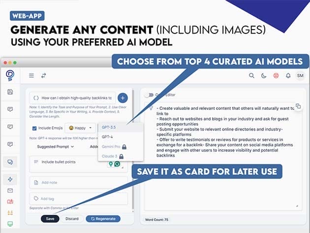 Chat with AI instantly from any webpage or inside the Web app and start the conversation. Choose from top curated AI models: GPT, Claude 3, Gemini Pro, and moe. Every conversation gets auto-saved in your draft or can be saved separately as a card for later use.