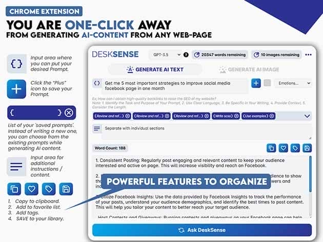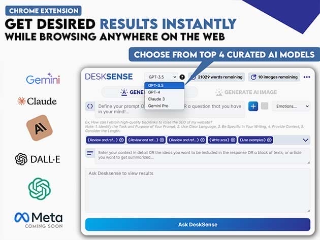 Unlock endless possibilities with DeskSense, your #1 AI-powered personal assistant designed to transform productivity and creativity. Effortlessly analyze text from any webpage, generate and summarize content, and get precise answers and suggestions on a wide range of topics. DeskSense excels in organizing and saving content with easy tagging and favoriting, while also creating complex Excel formulas and offering tailored coding solutions. Craft professional emails, generate engaging marketing content, and unleash your artistic side with AI-powered image creation. Enhance your browsing experience with smart suggestions and a customizable interface in both light and dark modes. DeskSense is your ultimate tool for a smarter, more organized, and creative digital life.