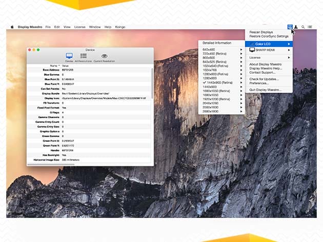 Display Maestro gives you full control over attached displays, allowing the use of all available resolutions and bit depths. Latest versions of macOS strip out the useful ability to set specific resolutions and presents a more user-friendly approach. Experienced users, especially graphic designers and presenters, demand more precise control of their devices. Access exactly the resolution you need with Display Maestro’s traditional Mac-like menu!