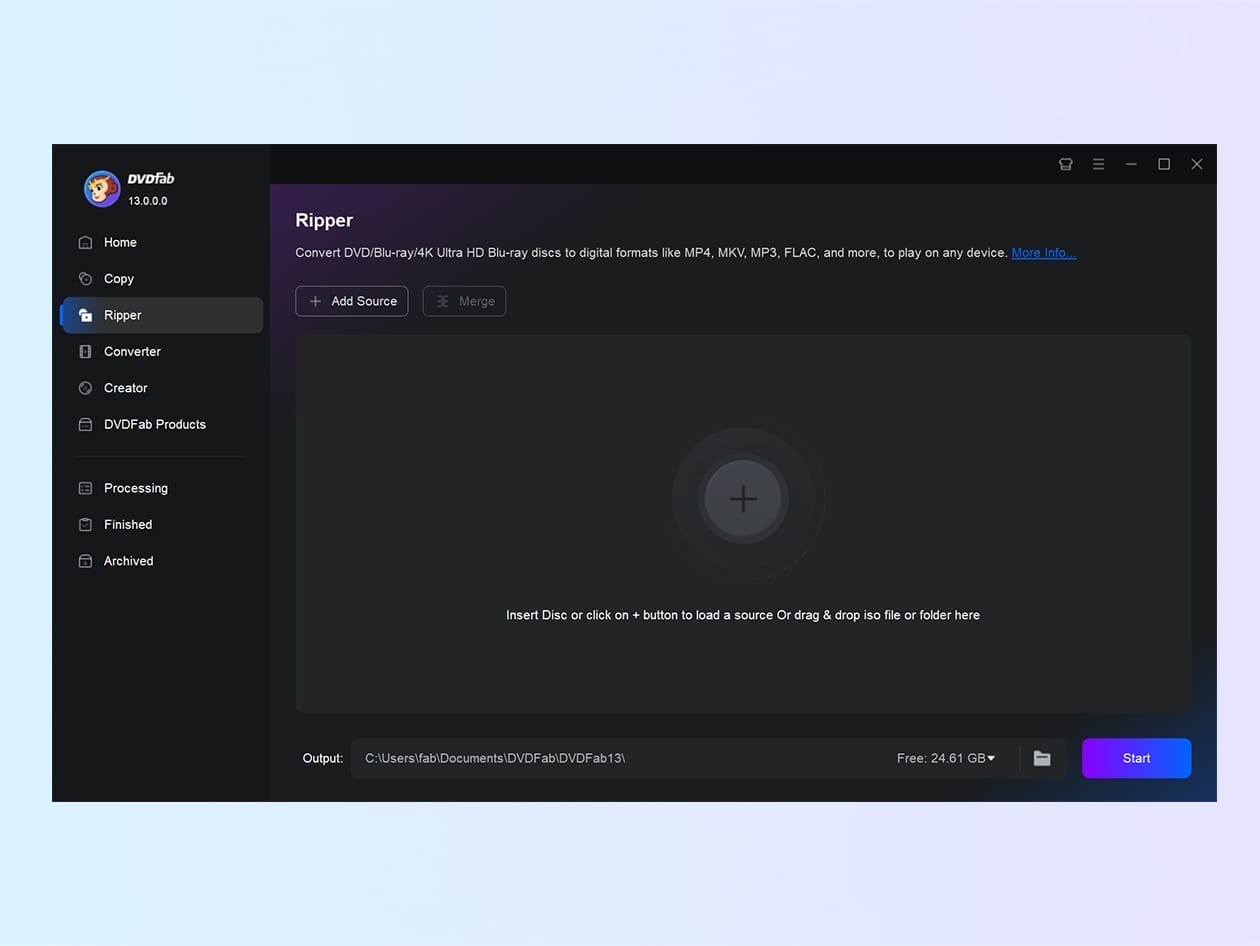 Launch DVDFab DVD Ripper and insert your DVD disc, or load a DVD folder or ISO file using the “+ Add” button on the main interface