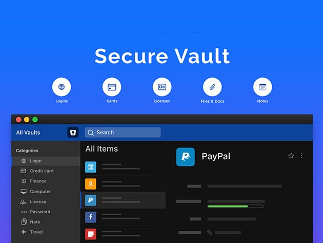 Stores all your logins, credit cards, bank accounts, licenses, files, documents, or any other information