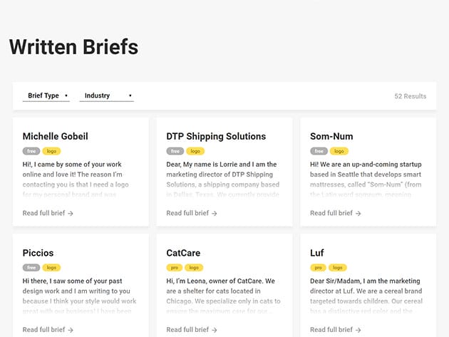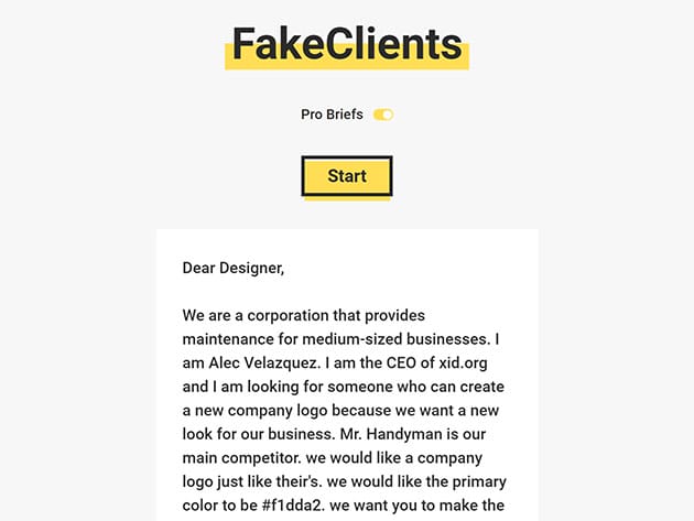 FakeClients.com is an easy-to-use, free tool for beginning logo designers to practice their logo design skills. Using the logo design brief generator you can generate prompts that you can work on as if they were real clients. Use these prompts to practice, fill up your portfolio or prepare for a job interview. Because of the huge amount of potential combinations, no brief is the same. Try to work on the fake client briefs just like you would when working on a real client’s request and go through your whole design process to get as much practice and the best result. Once you are finished with your design, you can add it to your portfolio, share it or try to get some feedback on the feedback platform of FakeClients