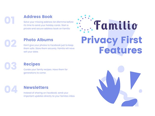 Some memories aren’t for Facebook; they’re just for your family. Give your whole family access to create private and secure family photo albums with Familio. Familio is a privacy-focused platform for family needs. Collect your family contacts, recipes & precious memories in one private, safe, and secure place. Store unlimited high quality photos in organized albums. Add unlimited recipes and share them with your family members. Auto collect your contact’s mailing addresses through automated reminders. Your data is safe and secure forever. Take advantage of this offer to ensure your lifetime subscription.