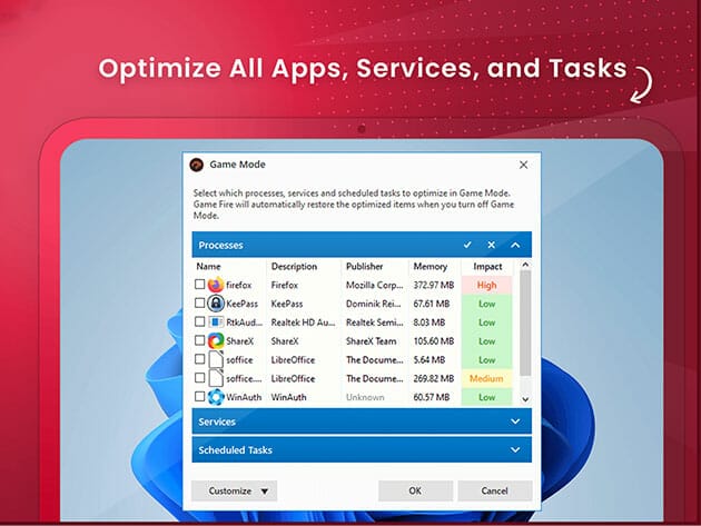 Game Fire is a handy tool for PC gamers, which enhances your PC performance and reliability. Game Fire provides a quick start setup wizard to get you started in no time. Game Fire also optimizes your computer performance by turning off unnecessary system features, applying various tweaks, and focusing computer resources on the games you are playing.