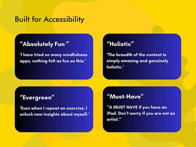 From exercises made with accessibility in mind to 100s of original artwork to a minimal yet powerful canvas, Groodles brings non-clinical art therapy to the masses. No need to be an artist, Groodles is for everyone.