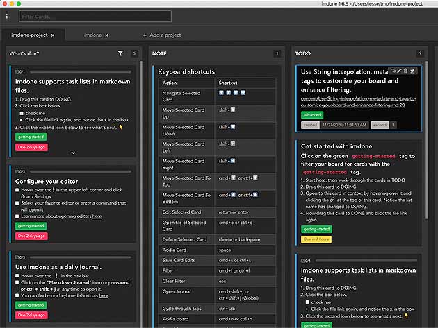 Imdone is a simple and powerful kanban board for people who work with markdown and code. Blocks of markdown in your notes, docs, and code are represented as cards on your kanban boards. You can add and edit cards using the built-in card editor or your favorite text/markdown editor, making it very convenient to update your tasks while you’re working on a markdown document or code. This app also enables you to organize your comments, get work, and add cards lightning fast!