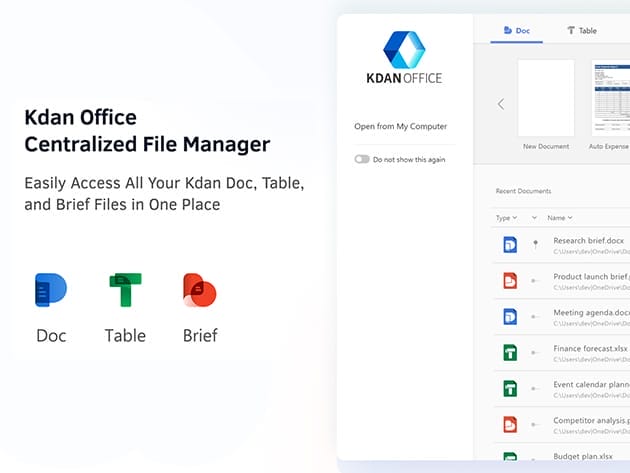 Kdan Office is an all-in-one office solution for all your document needs on your Windows PC. With Kdan Doc, Kdan Table, and Kdan Brief, the comprehensive office suite empowers you to create professional documents, manage data, make presentations, and deliver high-quality work effortlessly.