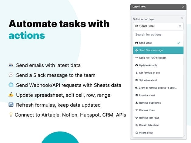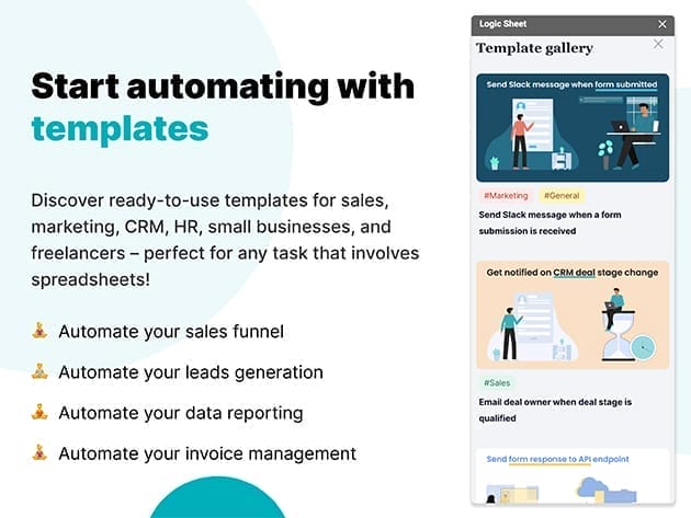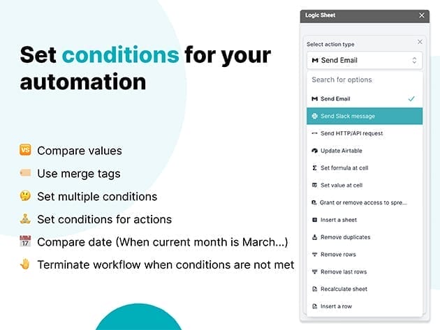 Set up a single automation workflow, and let Logic Sheet do the work for you. Logic Sheet is a Google Sheets add-on that helps you automate your work. For example, you can set up automation workflows to let Logic Sheet send an email notification or send a Slack message when your spreadsheet is edited.