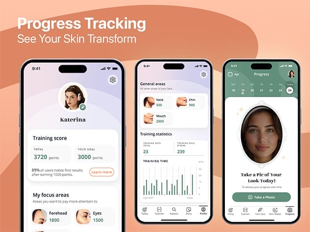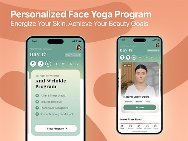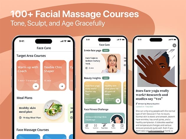 100+ face yoga and skincare courses addressing all facial areas and issues, including double chin, wrinkles, turkey neck, nasolabial folds, and more.
