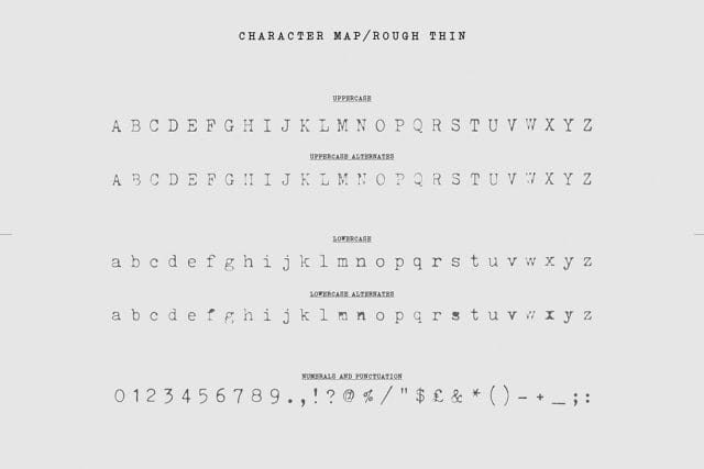 Rough and Rough Thin both come with full alphabetic alternates in upper and lowercase, depicting where the keys are blocked with ink, and creating broken shapes that remove boring repetition and add even more personality and authenticity.
