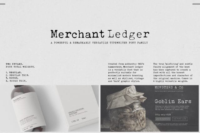 Normally, this vintage font family font sells for $14, but for a limited time only, you can get Merchant Ledger Typewriter for only $5! That’s a saving of 64% off the regular price. Or pay just $7 and get both the desktop and web fonts combined.