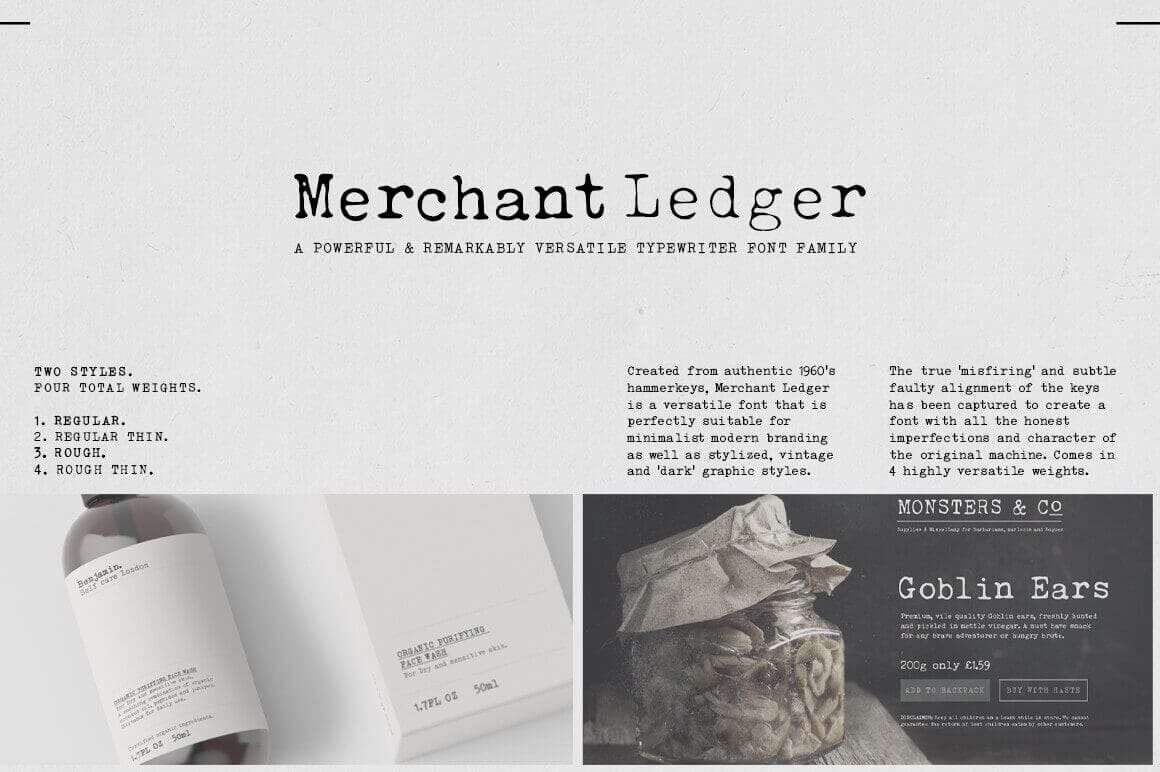 There are few fonts that are more versatile than typewriter fonts. From modern minimal branding to dark and gritty posters, a typewriter font can effectively do it all. So, say hello to Merchant Ledger! Developed from authentic typewriter hammer keys, this typeface comes in two styles (clean and rough), each in two weights (regular and thin). The result is a small family of remarkable versatility.