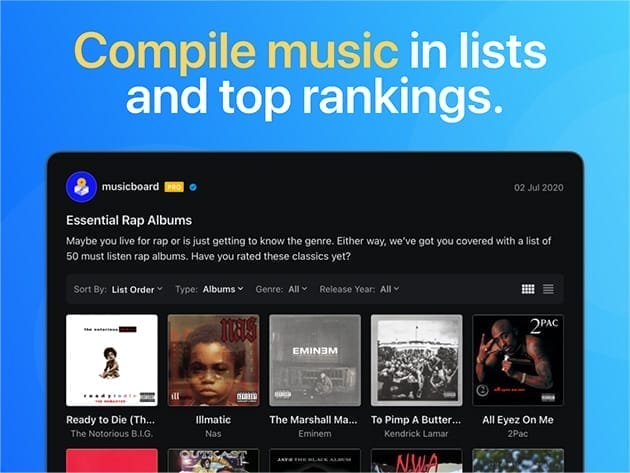 Collect music into lists and show off your favorite albums, rank an artist’s discography, and more |