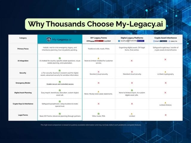 With My-Legacy.ai, you are giving your family clarity, comfort, and confidence when they’ll need it most.It’s not about how much you have — it’s about how easily your loved ones can find what you left behind.That’s the real inheritance. And right now, most of us are unprepared and My-Legacy takes your excuses away.