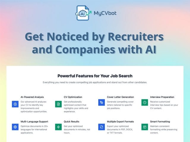 Struggling with job applications? MyCVBot is your AI-powered assistant, creating tailored CVs, writing standout cover letters, and making each job application tailored and more effective—all in just a few clicks. Save hours of manual work and increase your chances of landing interviews with smart, personalized application tools designed to impress recruiters. Whether you’re a fresh graduate or a seasoned pro, MyCVBot helps you stay ahead in today’s competitive job market.
