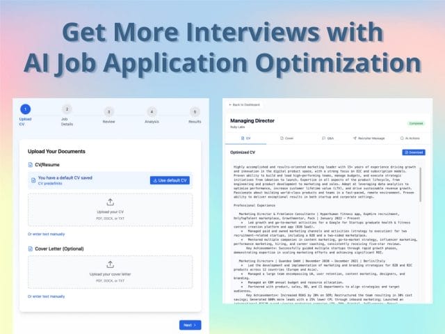 AI-Powered Optimization: AI analyzes your content & provides a new tailored resume, cover letter, and message for the recruiter, together with interview preparation Q&A and smart suggestions to highlight relevant skills and experiences.