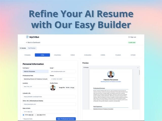 Each optimization requires 1 credit. This includes an optimized CV, a tailored cover letter, tailored interview questions with suggested answers, and recruiter outreach messages – all generated for the specific job you’re applying to. If you want, you can also use the Resume Builder; it costs 1 credit for 1 day of unlimited usage (please remember to download your resumes since they won’t be saved).