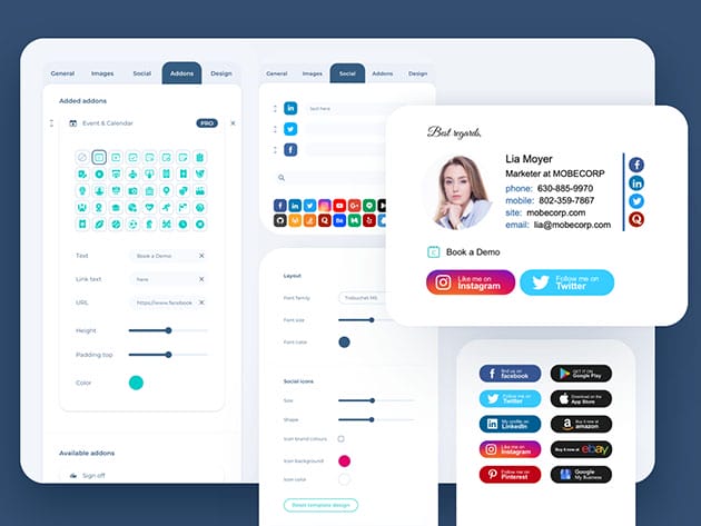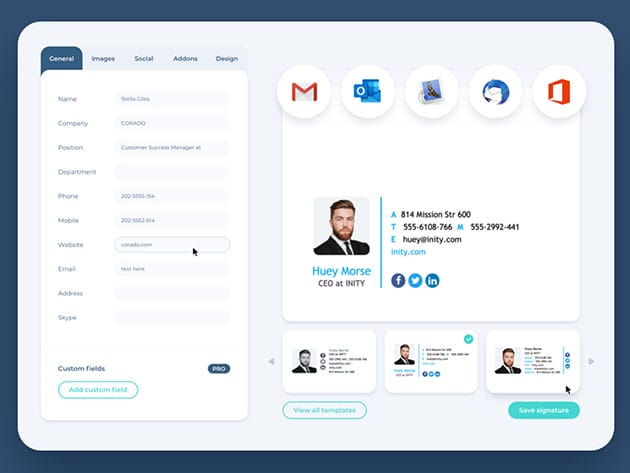MySignature is a simple and advanced online email signature generator. It allows you to easily create branded email signatures and make your business emails look even more professional. You can build brand recognition by turning your team into brand ambassadors. Increase brand awareness, create trust, and boost credibility by creating personalized email signatures with your logo/photo, banner, contact information, links to social profiles, and calls-to-action. Your emails will be visually compelling in all major email clients (Gmail, Outlook/Office 365, AppleMail, Thunderbird, and more) and devices. Embedding a unique email signature will help you advertise the products or services in a more efficient way.