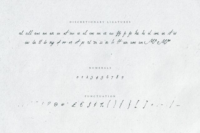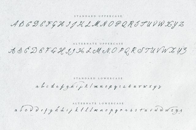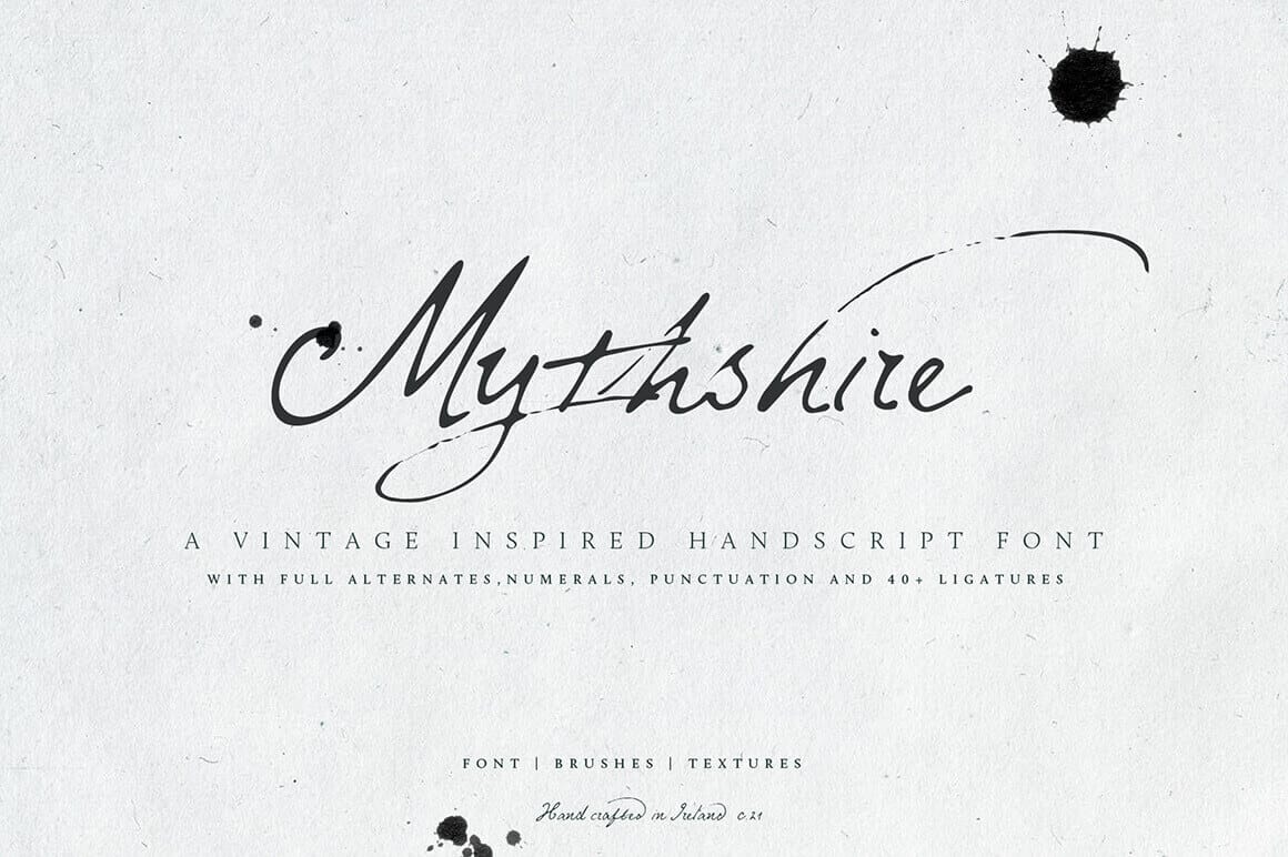 Mythshire is a handscript font inspired by the cursive and personality-rich handwriting styles of the past. Loaded with a full set of alternate characters (both upper and lowercase) as well as 40+ ligatures there are plenty of options for creating authentically flowing type.