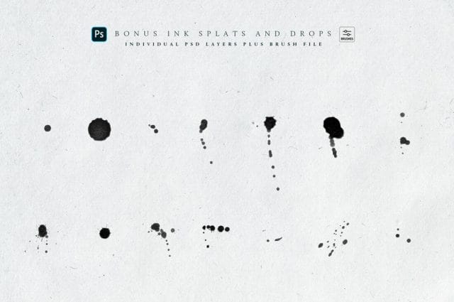 As part of the download the deal includes 8 high resolution paper textures (6000 x 4000px) as well as 14 Ink splats. The Ink splats have been scanned at 600 dpi and are provided in psd format (each on its own named layer with transparent background) and as a Photoshop brush set.