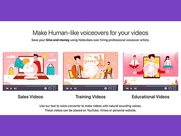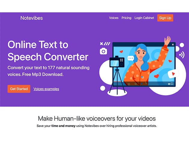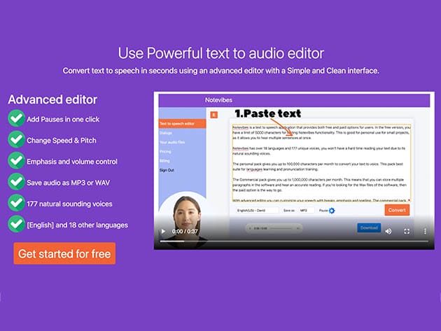 Notevibes is an advanced platform with a simple interface that converts text to speech in seconds. You can add pauses, change speed & pitch, and add emphasis and voice control. The converted audio is available for MP3 and WAV download. With 1,200,000 characters, 177 premium voices, and 18 languages available, the Personal Pack is perfect for private listening and personal eLearning.