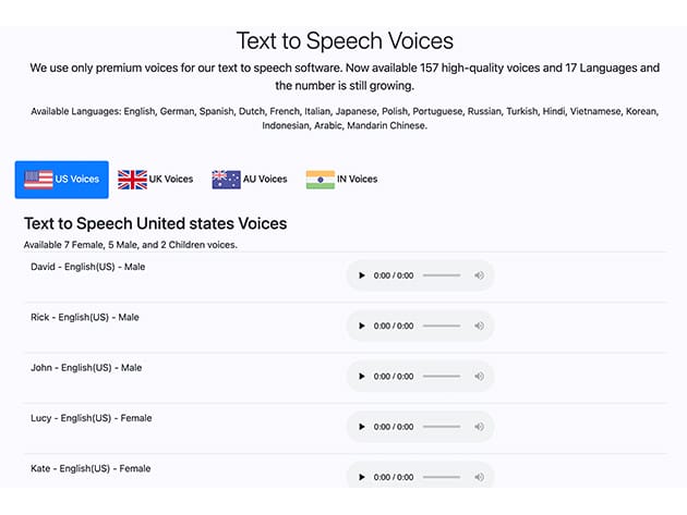 Make human-like audio with 177 voices & 18 languages
