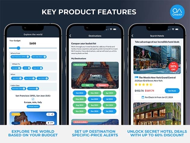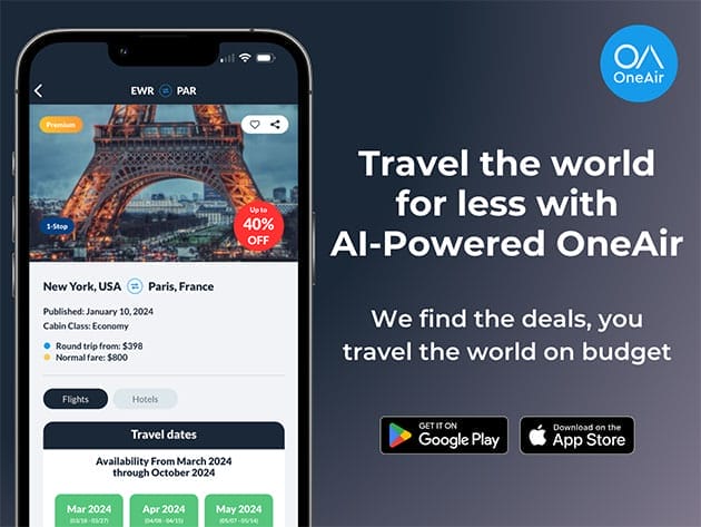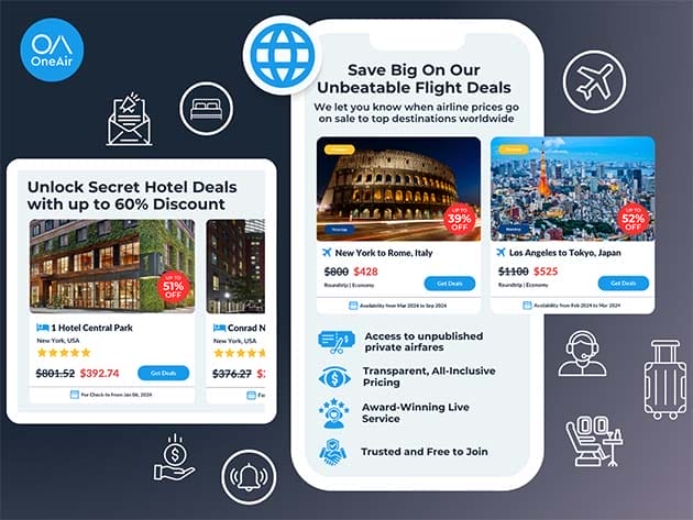 OneAir is an AI-powered all-in-one, members-only travel app. Our AI engine scans and tracks millions of airfares and hotel data to top destinations globally. When the prices drop, members receive an email and a mobile alert.