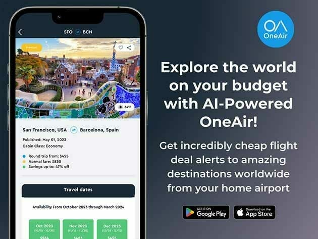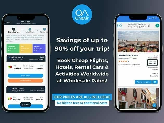 OneAir is an AI-powered all-in-one, members-only travel app that helps you find awesome flight and hotel deals with deep discounts you won’t find anywhere else. Our intelligent engine scans and tracks millions of fares in real time to top destinations worldwide. When the system finds an incredibly cheap flight deal, members receive an email and a mobile alert.