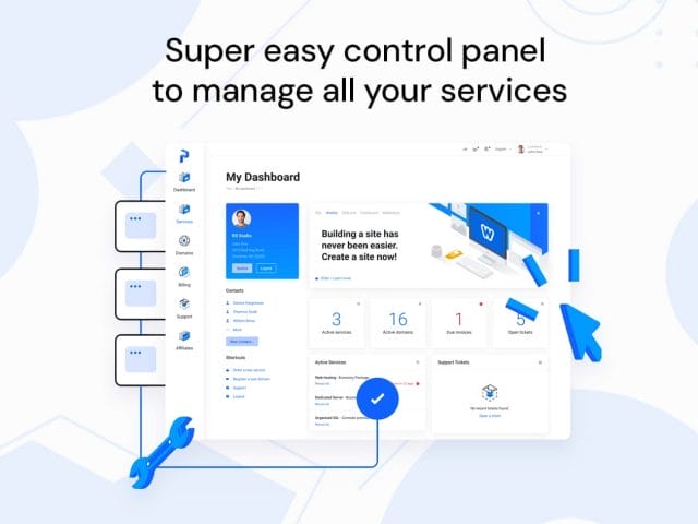 Awesome Client Interfaces: Take control with an intuitive panel to manage websites, servers, mailboxes, and billing effortlessly.