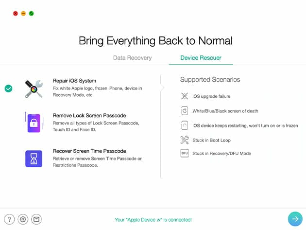 Fix any iOS system upgrade failure, from being stuck on the white apple logo to a black screen, without losing current data