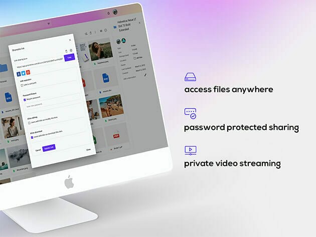 Keep all your important files securely in one place. Easily share large files, like video, graphics, images, and audio. Access files from your computer, your phone, or your tablet. Preview popular file types, like Microsoft office, mp4, or jpeg in your browser or app without the need to download the file. We meet or exceed industry standards to ensure your data is safe.