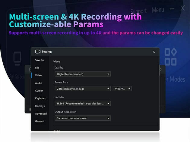 • Wide video compatibility settings. Output video formats — mp4, avi, flv, & gif; video parameter settings: quality, frame rate (VFR/CFR), encoder (H.264/MPEG4), resolution settings (up to 4K)