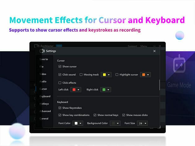 • 7 recording modes. Integrated with helpful & easy modes – Full-screen Mode, Custom Area, Game Mode, Program Window, Follow Cursor, Webcam Recording, & Audio-only Mode